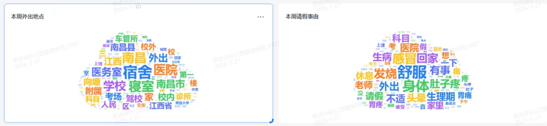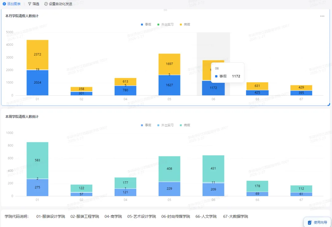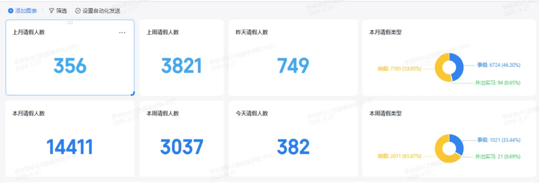例如,请假流程仪表盘,可按日、周、月维度统计请假人员信息,自动汇总各学院请假人数分布,并直观展示各类请假类型占比情况。网络报修仪表盘,全面呈现各运营商、各区域报修数量及故障类型分布等关键数据,为问题研判与运维管理提供数据支撑。