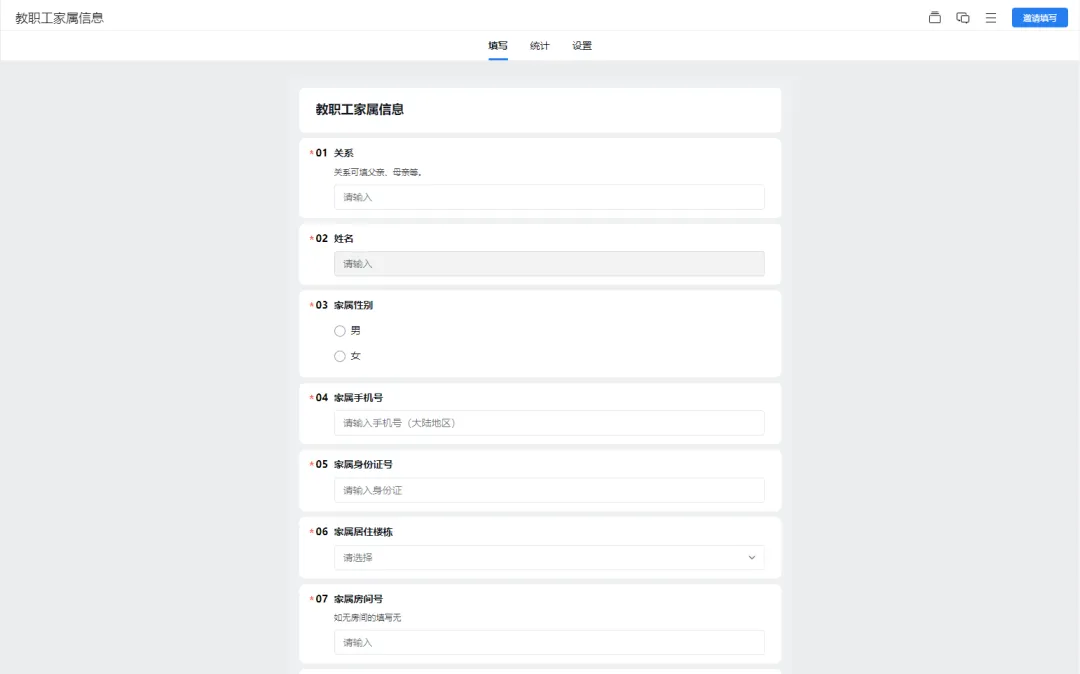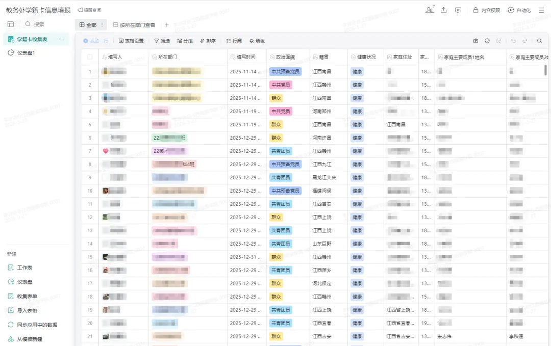 依托企业微信文档【收集表】功能,高效开展教务处学籍卡信息与教职工家属信息采集工作,通过系统自动汇总、分析表单数据,实时生成多维度可视化报表,实现信息收集规范化、数据管理智能化、成果展示直观化。
