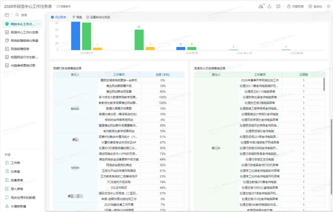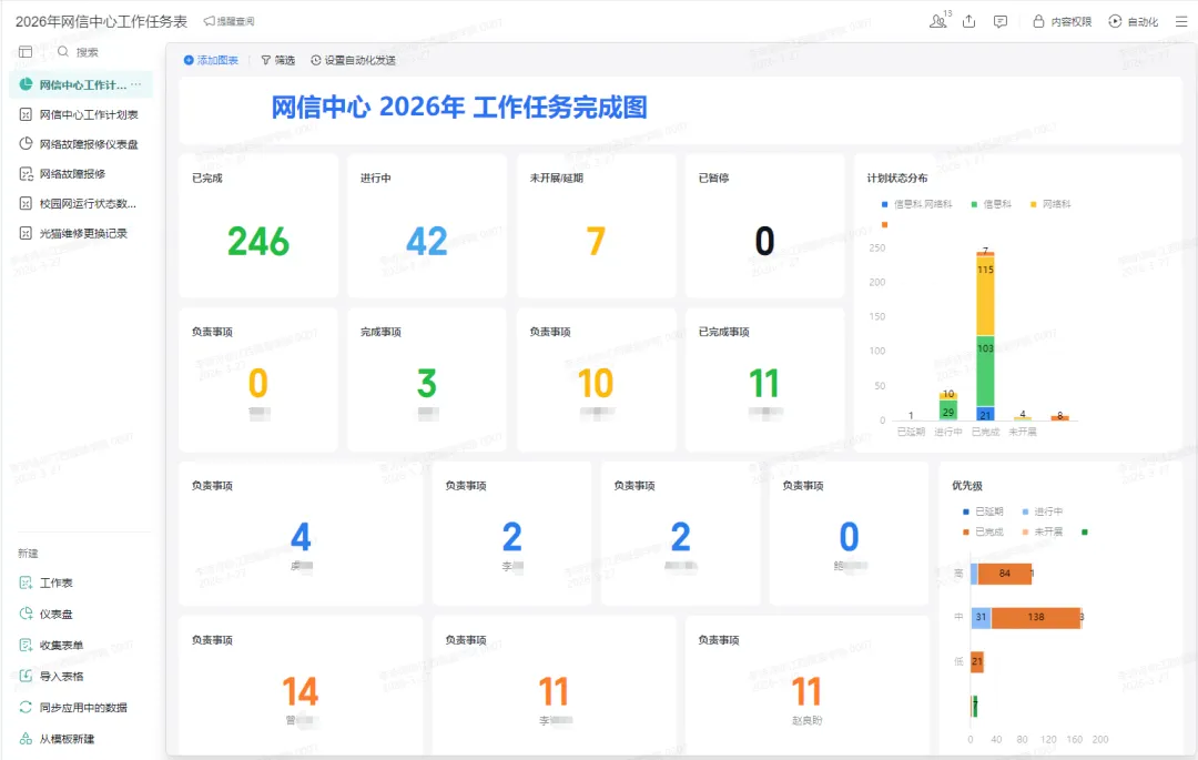 充分运用智能表格可视化仪表盘功能,构建部门工作计划统一汇总、集中管理,实现对各科室及人员工作落实情况的实时查询、全程跟踪、动态展示。精准掌握各岗位工作推进进度、阶段成效与落实动态,有效强化工作统筹调度和过程管控。将智能表格与线上审批流程深度融合,实现各类审批流程数据的一键归集、实时同步,针对不同业务流程定制可视化展示界面。